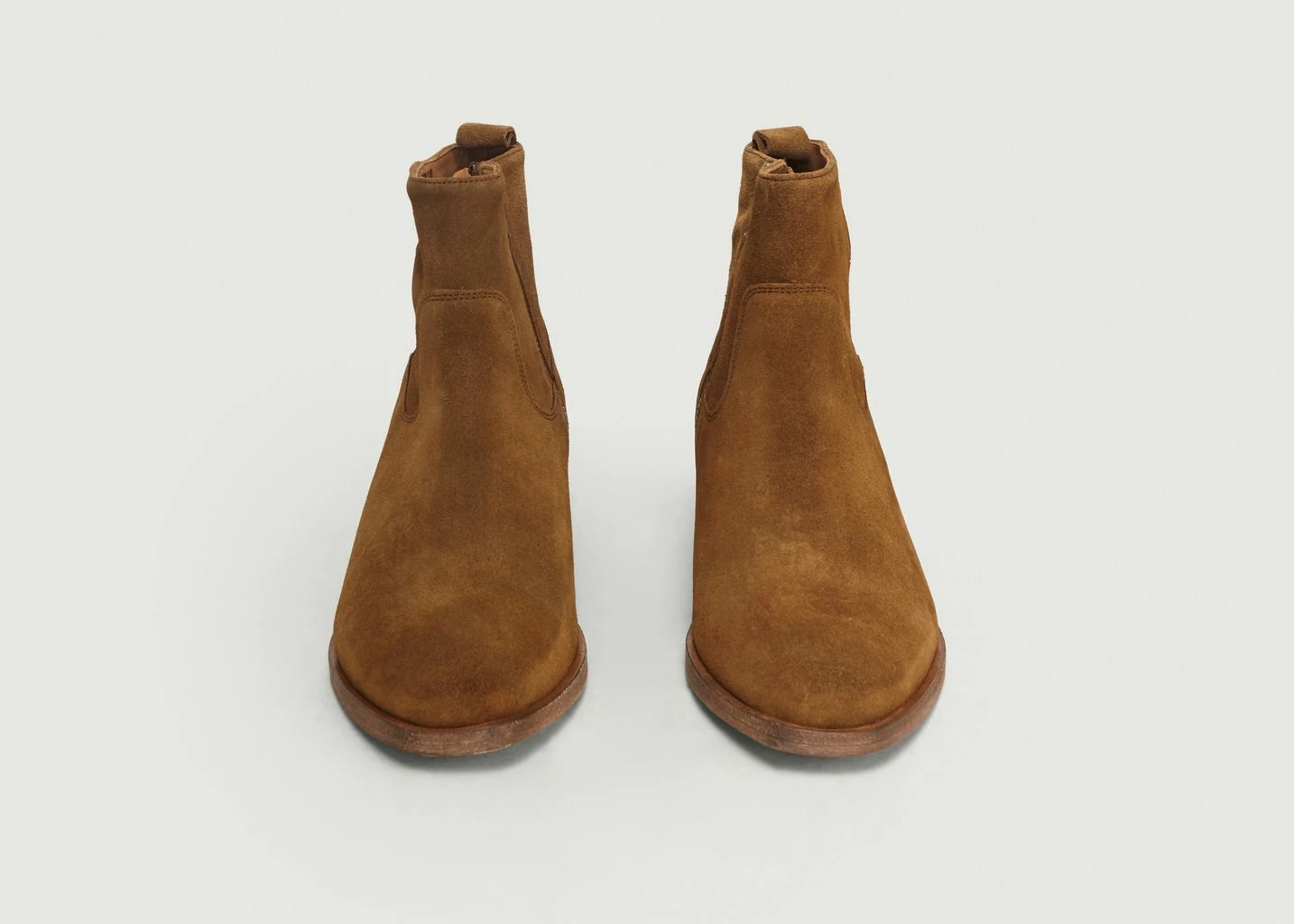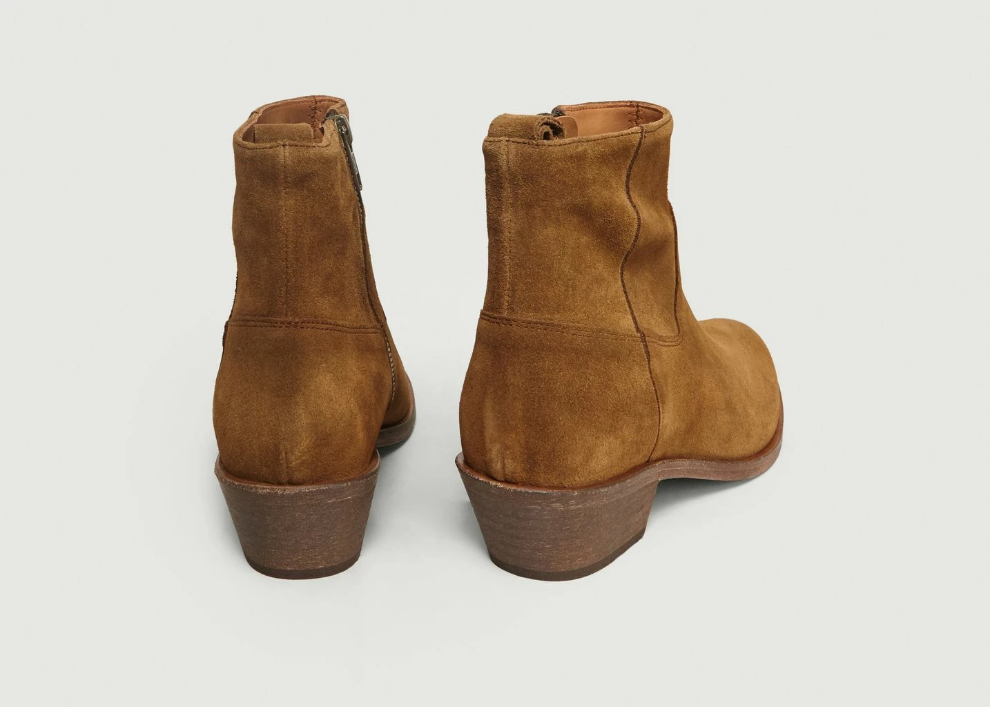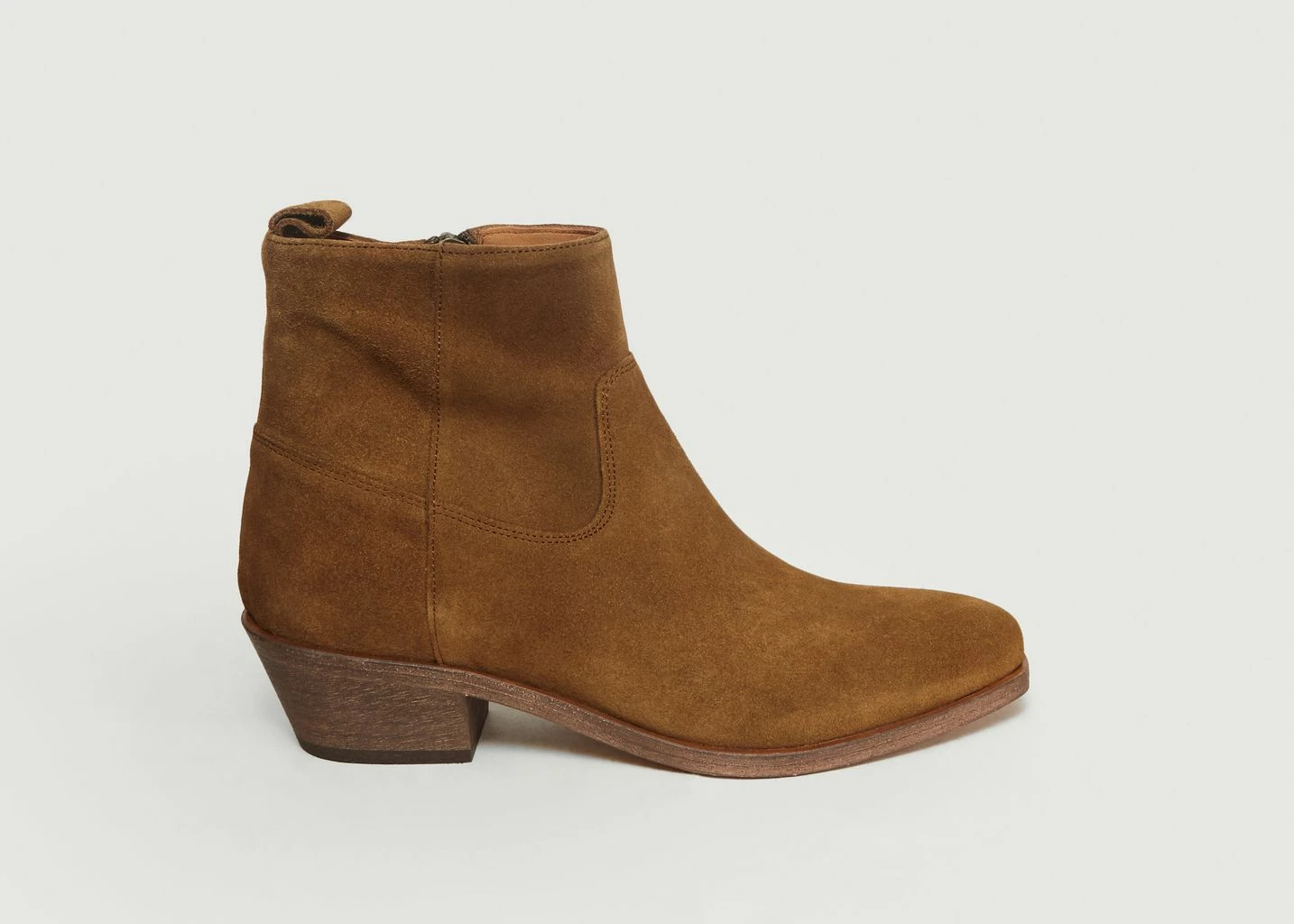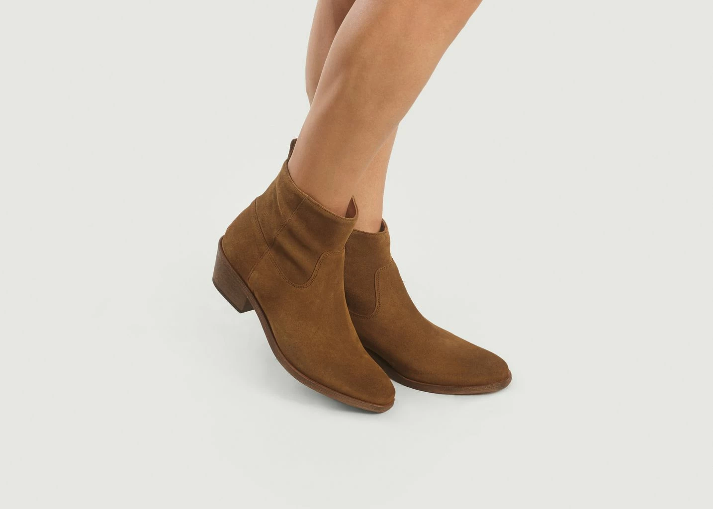 Brown suede ankle boots, round toe, side zip closure, 4,5 cm heel, tonal topstitching, back heel tab. Anthology Paris is a French leather goods brand founded in 2011. Defined by its accessories crafted from a curated collection of the world’s best leather, each piece is sourced from artisanal tanneries and beautifully constructed to ensure an authentic and contemporary finished product. A rich suede silhouette at a comfortable ankle height, step into the new season in style with these luxury Winona boots from Anthology. Style with a delicate ruffle blouse in rich cream and wide leg trousers for an authentic boho look.